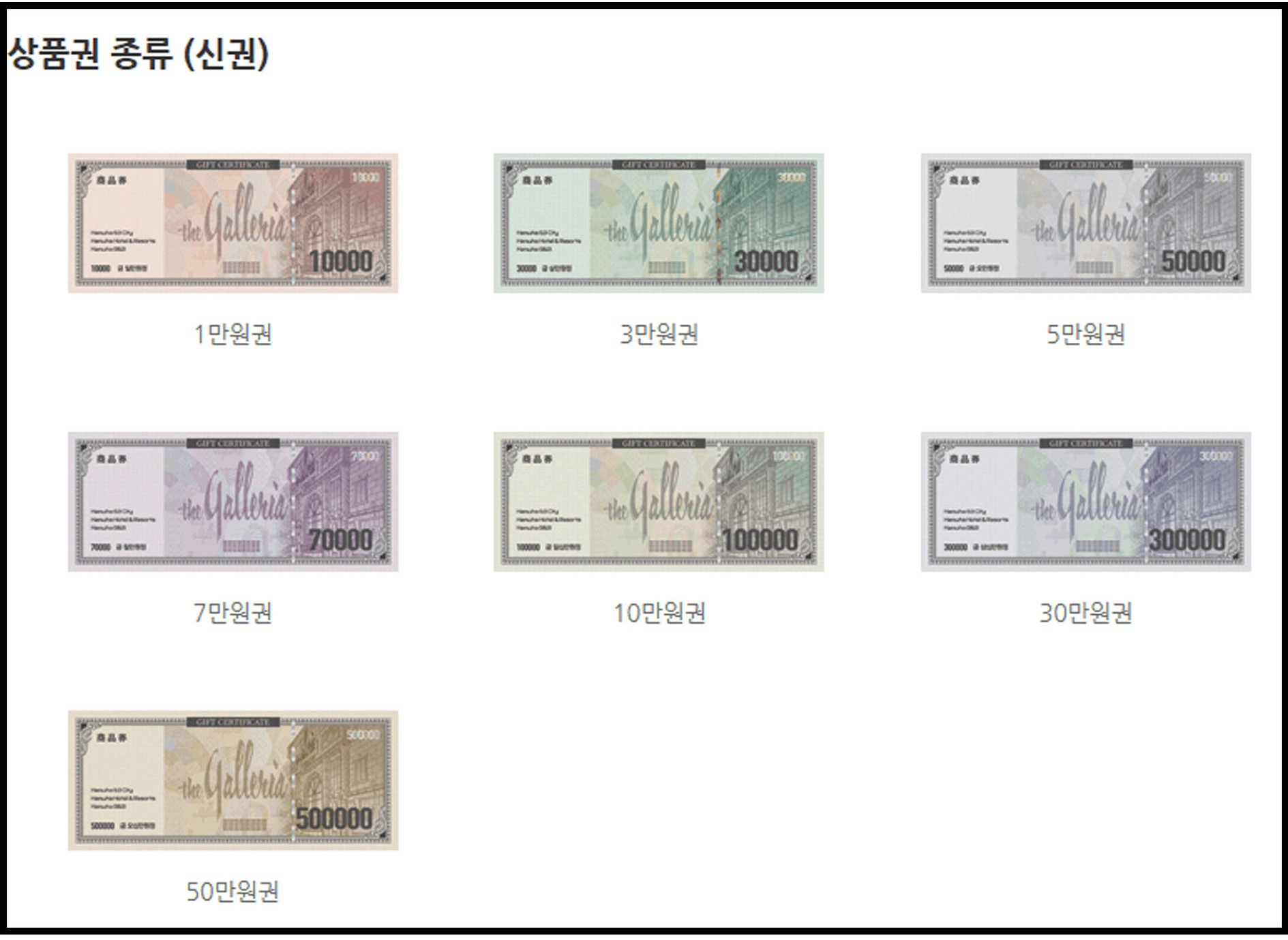 갤러리아 상품권은 구권과 신권 두 종류로 이루어져 있습니다.