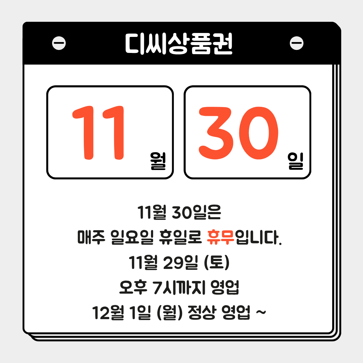 11월 말일을 맞아 영업 및 휴무 일정을 안내드립니다.
