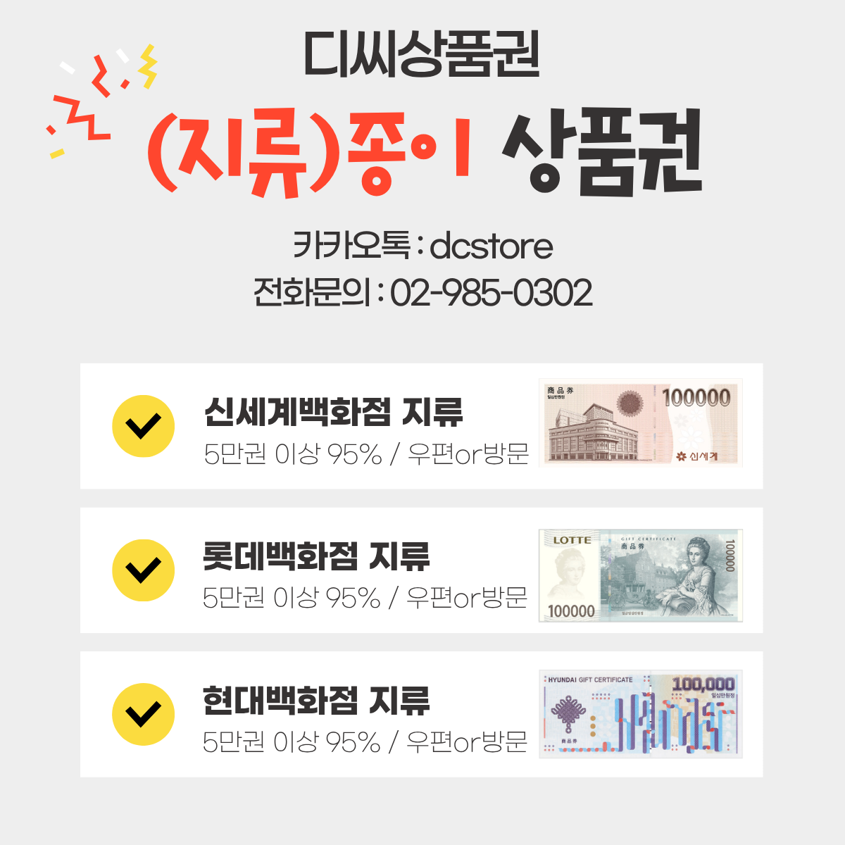 저희 디씨상품권은 각종 백화점 상품권, 티머니, 이즐(구.캐시비), 컬쳐랜드, 문화상품권, 북앤라이프, 스타벅스 등 다양한 상품권을 신속하고 안전하게 매입하고 있습니다.